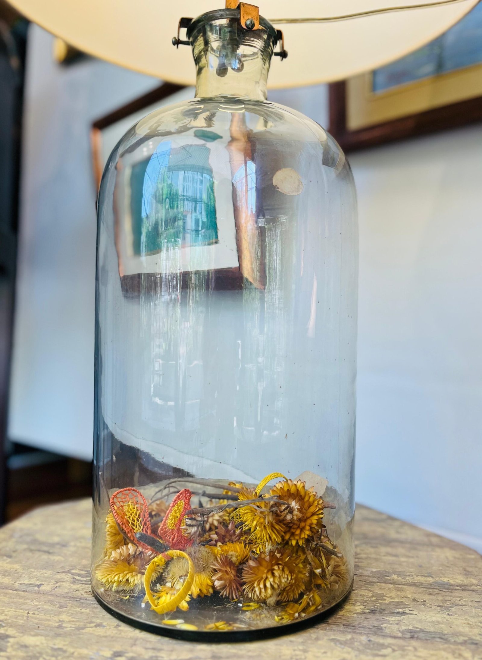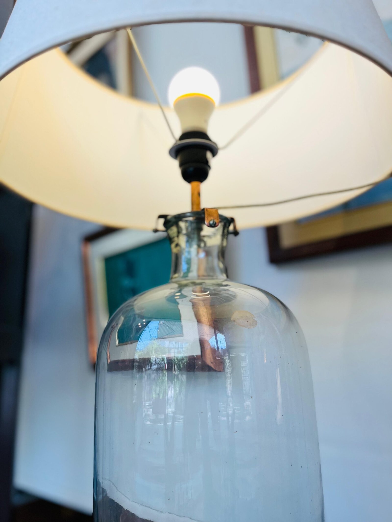 Pieza decorativa vintage realizada con botella de finales del siglo XIX e inicios del XX, convertida en una elegante lámparas de mesa para interior.